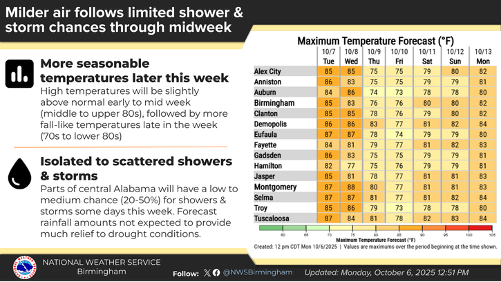 High temperatures will be slightly above normal early to mid week (middle to upper 80s), followed by more fall-like temperatures late in the week (70s to lower 80s). Parts of central Alabama will have a low to medium chance (20-50%) for showers & storms some days this week. Forecast rainfall amounts not expected to provide much relief to drought conditions. |