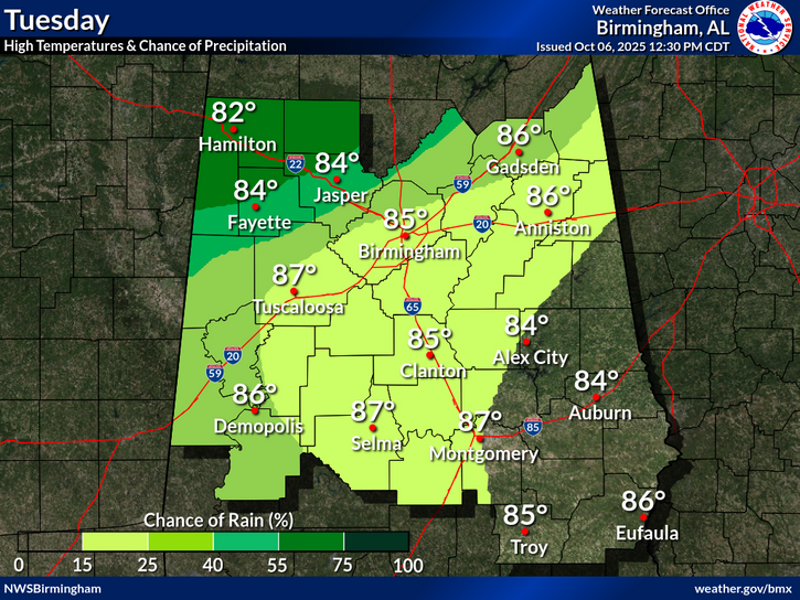 Rain chances on Tuesday will remain across the northern half of the forecast area, with highest rain chances confined to the I-22 corridor. High temperatures are expected to be in the lower to middle 80s with partly to mostly cloudy skies. |
