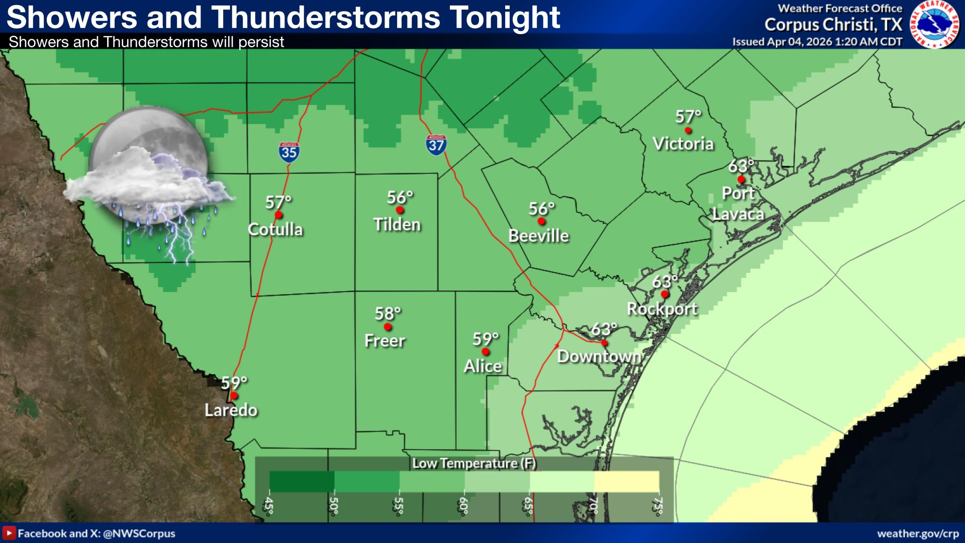 | Showers and thunderstorms are expected to persist through the night with lows from the upper 50s and lower 60s along the coast. |