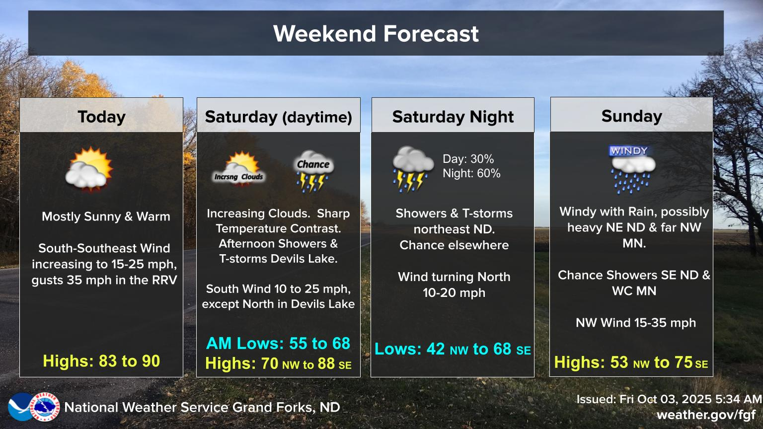 Warm, breezy today highs in the 80s to around 90. Mild tonight. Saturday into Sunday will see a cold front slowly advance southeast across the area. Behind the front is rain, north winds, and much cooler temperatures. From this system, potential for over 1 inch of rain in the Devils Lake region. Much less rain farther south/east with little rain in west central MN. |